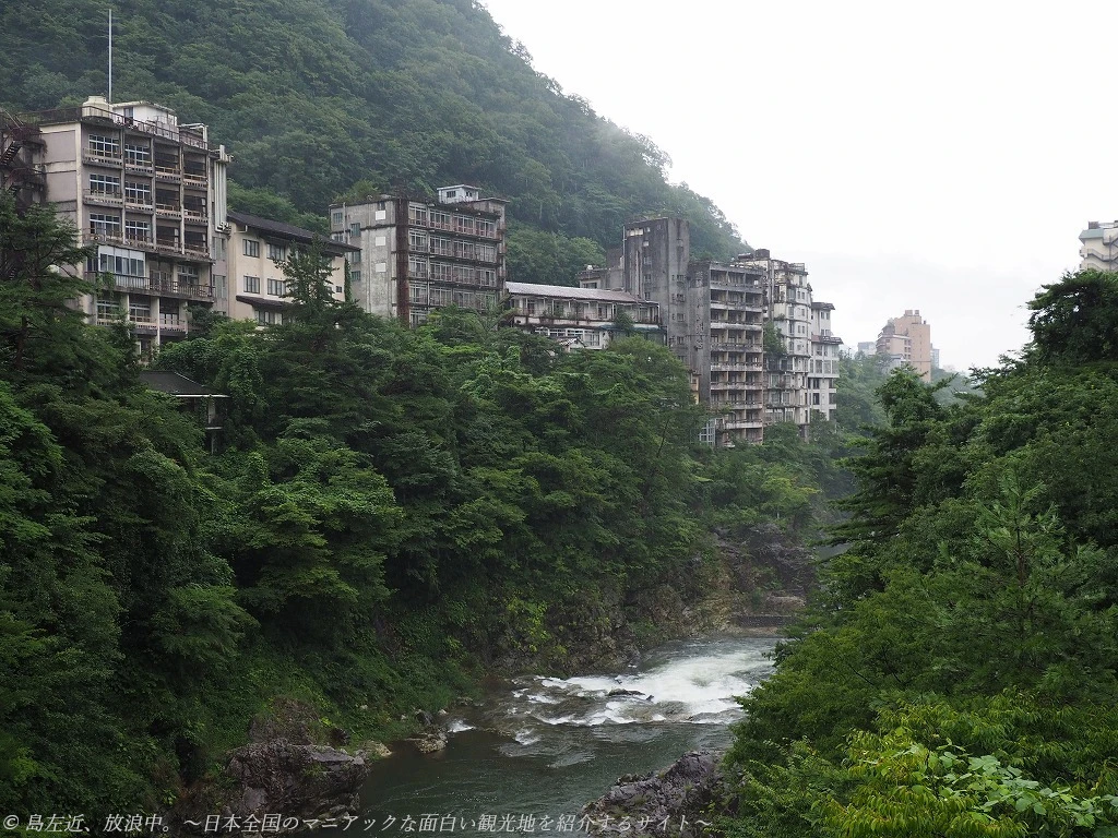 滝見橋から南側。左手には廃墟が建ち並ぶ。