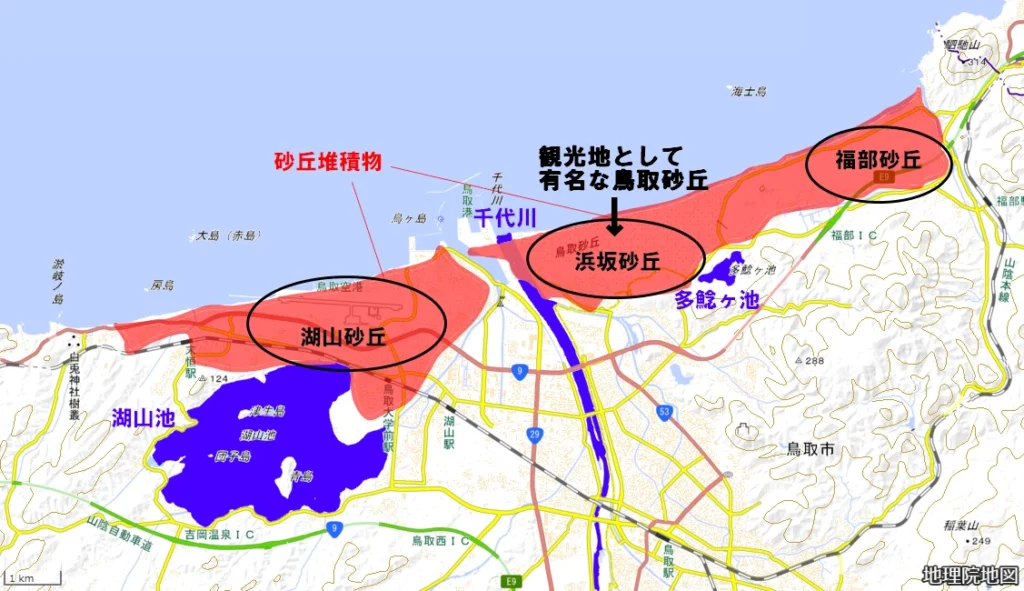千代川(せんだいがわ)を挟んで、西側に湖山(こやま)砂丘、東側に浜坂(はまさか)砂丘、福部(ふくべ)砂丘という名前がつけられている。